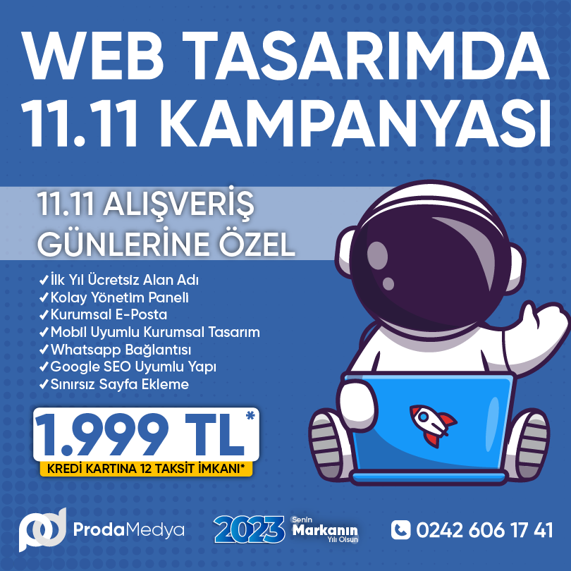 Antalya Web Tasarım Ajansı Proda Medya olarak 11.11 alışveriş günlerine özel olarak hazırlamış olduğumuz kampanyamızı sizlere sunuyoruz. Antalya web tasarım ajansı Proda Medya olarak 1999 ₺’den* başlayan fiyatlarla kurumsal web sitenize sektörün&...